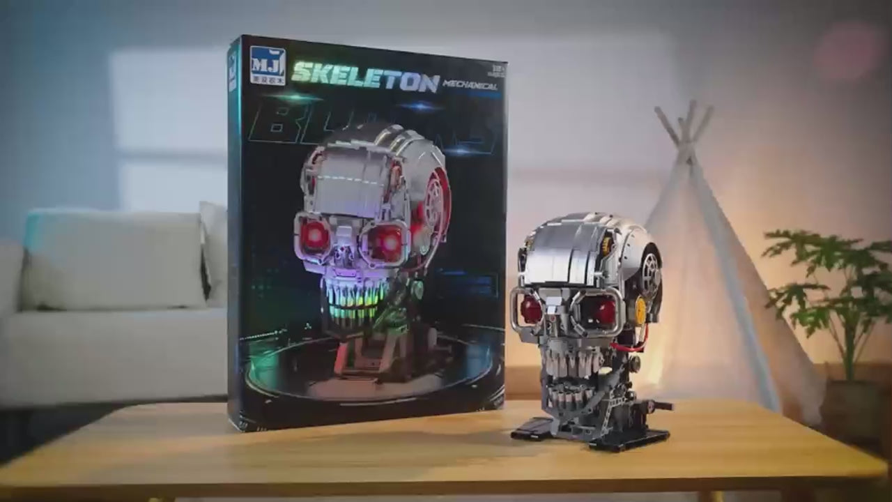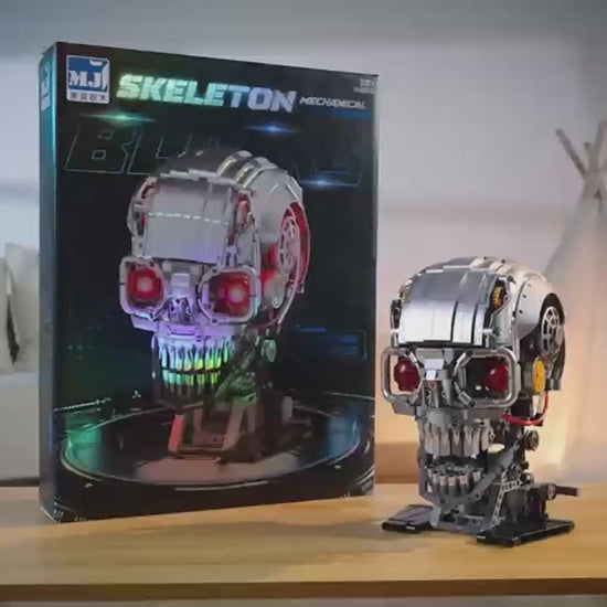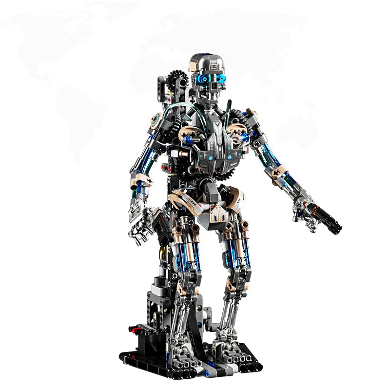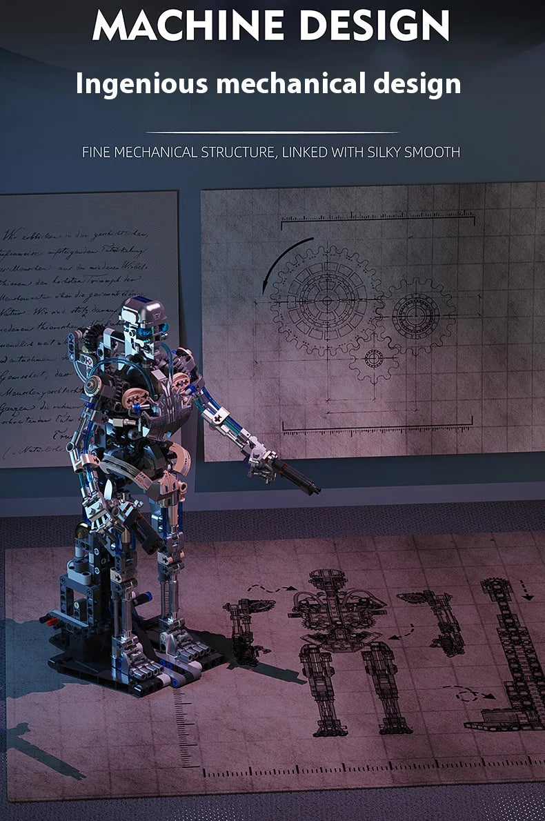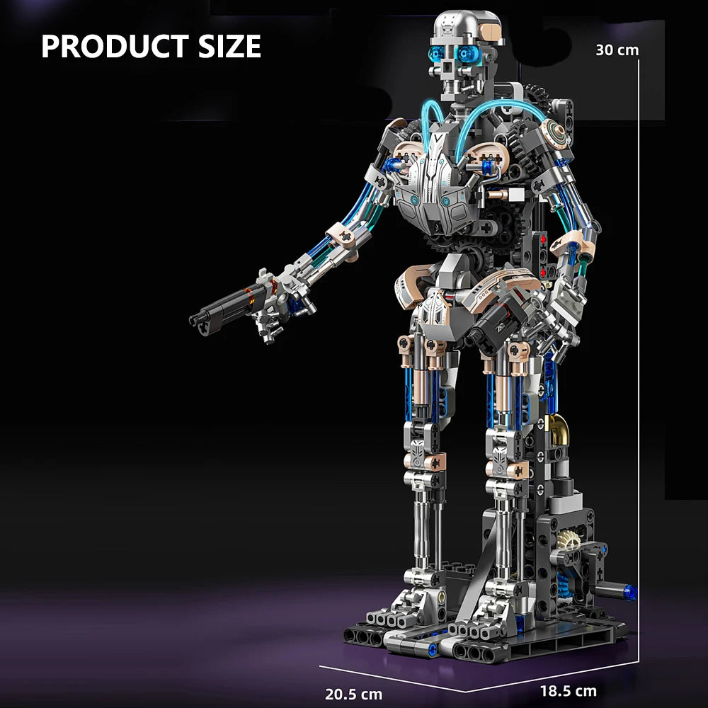 The robot shown is the MJI 13091 building block set. It is a mechanical-style robot model that has been noted to resemble the Terminator Endoskeleton.