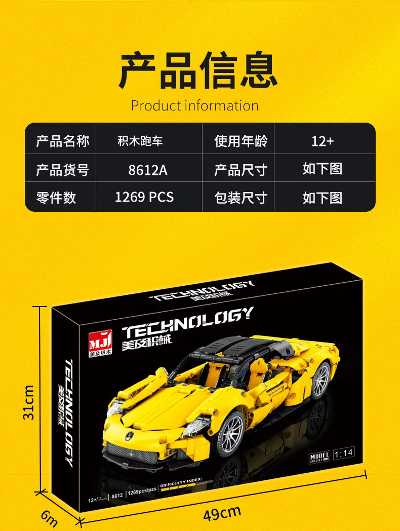 MJI 8612A, Creative LEGO-style construction sets, 1269pcs Luxury Technic Speed Super Racing car - Yellow