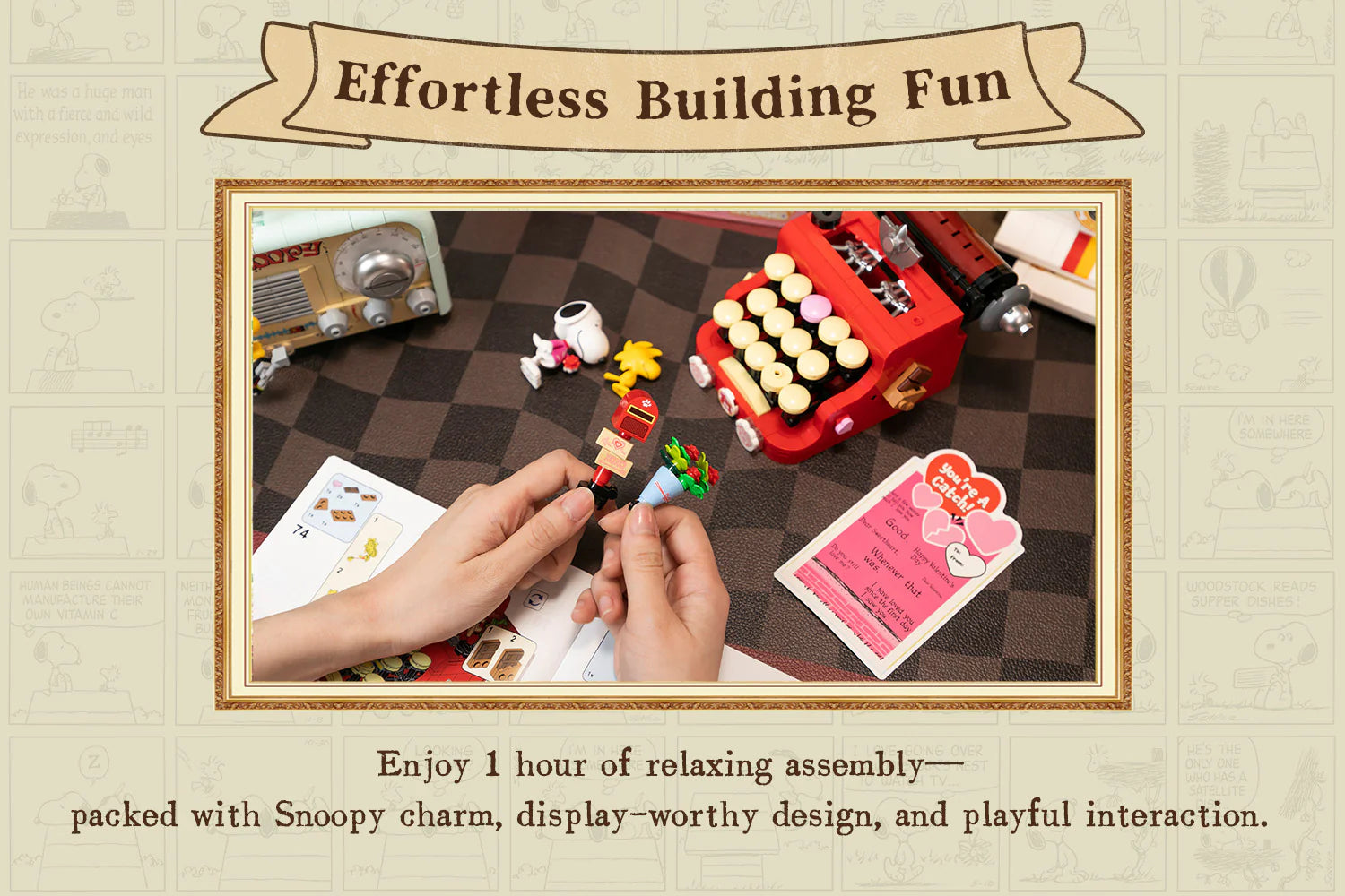 Typewriter building game. Inspired by the work of Charles M. Schulz and created by Pantasy. The set consists of 332 pieces. The minimum recommended age is 6 years. Press the pink button to make the letter paper appear, simulating the effect of a real typewriter. Height: 18 cm.